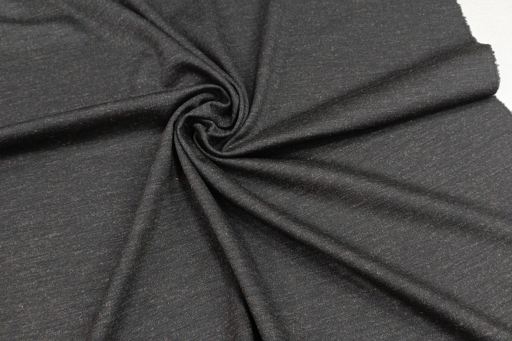 Итальянское черное джерси. Полотно эластичное, мягкое и приятное на ощупь ткань, которая хорошо тянется и не стесняет движений. Эта ткань хорошо держит форму, не пиллингуется и долго сохраняет свой первоначальный вид при должном уходе. Она пропускает воздух, впитывает влагу и быстро высыхает, что делает ее комфортной для ношения в любое время года. Из джерси шьют разнообразную одежду, такую как футболки, майки, свитера, платья, костюмы и даже верхнюю одежду.